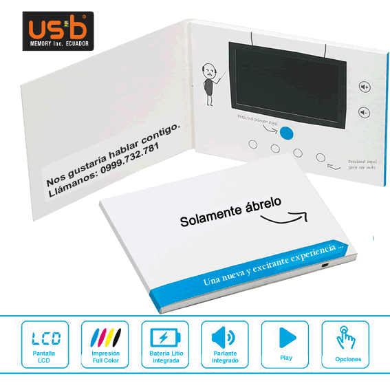 Tarjetas, Dípticos, Trìpticos, Calendarios, etc., que incluyen reproductor de video y sonido de última generación, ultra delgado y de alta resolución.